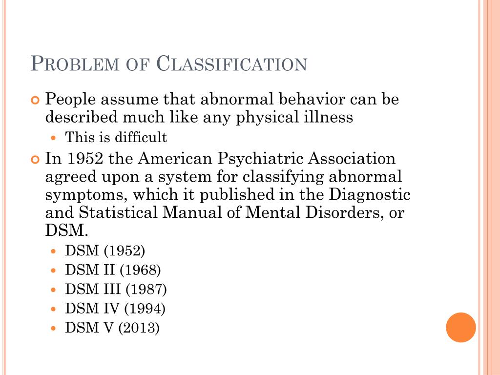 Problem of Classification • People assume that abnormal behavior can be described much like any physical illness • This is difficult • In 1952 the American Psychiatric Association agreed upon a system for classifying abnormal symptoms, which it published in the Diagnostic and Statistical Manual of Mental Disorders, or DSM. • DSM (1952) • DSM II (1968) • DSM III (1987) • DSM IV (1994) • DSM V (2013)