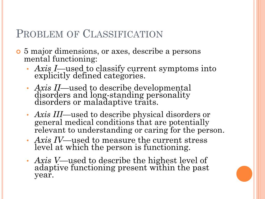 Problem of Classification • 5 major dimensions, or axes, describe a persons mental functioning: • Axis I—used to classify current symptoms into explicitly defined categories. • Axis II—used to describe developmental disorders and long-standing personality disorders or maladaptive traits. • Axis III—used to describe physical disorders or general medical conditions that are potentially relevant to understanding or caring for the person. • Axis IV—used to measure the current stress level at which the person is functioning. • Axis V—used to describe the highest level of adaptive functioning present within the past year.