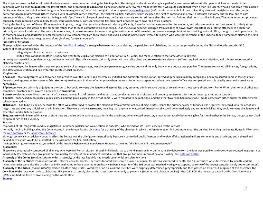 This diagram shows the ladder of political advancement (cursushonorum) during the late Republic. The straight ladder shows the typical path of advancement (theoretically open to all freeborn male citizens), beginning with election to quaestor, the lowest office, and proceeding to consul, the highest (of course very few men made it that far; it was quite exceptional when a man like Cicero, who did not come from a noble family, was elected consul). Red text designates “curule magistrates,” who had the right to sit on a special ivory folding stool (sellacurulis) as a symbol of their office; they also had the right to wear the purple-bordered toga (toga praetexta). Offices marked with an asterisk carried imperium, the highest political authority, which included the right to command an army, to interpret and carry out the law, and to pass sentences of death. Magistrates whose title began with “pro” were in charge of provinces; the Senate normally conferred these after the men had finished their term of office in Rome. The more important provinces, especially those requiring large military forces, were assigned to ex-consuls, while the less significant provinces were governed by ex-praetors. • During the Empire, most of these offices remained in place, though their functions changed. Most significantly, imperium was now reserved for the emperor, and advancement in rank proceeded in orderly stages based on conditions laid down by the emperors rather than through competitive electioneering. Thus the cursushonorum changed from a ladder of power (with important social status attached) to a ladder of primarily social rank and status. The cursushonorum was, of course, reserved for men; during the entire period of Roman history, women were prohibited from holding political office, though in the Empire their roles as mothers, wives, and daughters of emperors gave a few women very high social status and even a kind of indirect rank. Even elite women who were not members of the imperial family sometimes claimed the rank of their fathers or husbands (e.g., as consularesfeminae, “consular women”). • Principles of Structure: • These principles evolved under the impetus of the “conflict of orders,” a struggle between two social classes, the patricians and plebeians, that occurred primarily during the fifth and fourth centuries BCE. • system of checks and balances • collegiality—at least two in each magistracy • limited terms of political office (usually one-year term; eligible for election to higher office in 2-3 years. and for re-election to the same office in 10 years) • in theory was a participatory democracy, but in practice had oligarchic elements (primarily governed by an elite class) and representative elements (offices required popular election, and tribunes represented a plebeian constituency) • crucial role played by Senate, which was composed solely of ex-magistrates, was the only permanent governing body and the only body where debate was possible. The Senate controlled all finances, foreign affairs, and state administration and had by far the greatest social prestige. • Magistrates: • 2 *consuls—chief magistrates who convened and presided over the Senate and assemblies, initiated and administered legislation, served as generals in military campaigns, and represented Rome in foreign affairs. Consuls could appoint and/or serve as *dictator for up to 6 months in times of emergency when the constitution was suspended. When their term of office was completed, consuls usually governed a province as *proconsul. • 8 *praetors—served primarily as judges in law courts, but could convene the Senate and assemblies; they assumed administrative duties of consuls when these were absent from Rome. When their term of office was completed, praetors might govern a province as *propraetor. • 2 censors—elected every 5 years for terms of 1½ years; revised lists of senators and equestrians; conducted census of citizens and property assessments for tax purposes; granted state contracts. • 4 aediles—supervised public places, public games, and the grain supply in the city of Rome; 2 were required to be plebeians, and the other two (who had more status) could come from either order; the latter 2 were called curuleaediles. • 10 tribunes—had to be plebeian, because the office was established to protect the plebeians from arbitrary actions of magistrates. Hence the primary power of tribunes was negative; they could veto the act of any magistrate and stop any official act of administration. They were by law sacrosanct, meaning that anyone who attacked them physically could be immediately and summarily killed; they could convene the Senate and assemblies and initiate legislation. • 20 quaestors—administered finances of state treasury and served in various capacities in the provinces; when elected quaestor, a man automatically became eligible for membership in the Senate, though censors had to appoint him to fill a vacancy • Senate: • composed of 600 magistrates and ex-magistrates (minimum qualification was election as quaestor) who served for life unless expelled by the censors • normally met in a building called the Curia located in the Roman Forum; click here for a drawing of the chamber in which the Senate met, or find out more about the building by visiting the Senate House in VRoma via the web gateway or the anonymous browser • although technically an advisory body, in effect the Senate was the chief governmental body because it controlled public finances and foreign affairs, assigned military commands and provinces, and debated and passed decrees that would be submitted to the assemblies for final ratification • the Republican government was symbolized by the letters SPQR (senatuspopulusqueRomanus), meaning “the Senate and the Roman people” • Assemblies: • These were theoretically composed of all males who were full Roman citizens, though ind