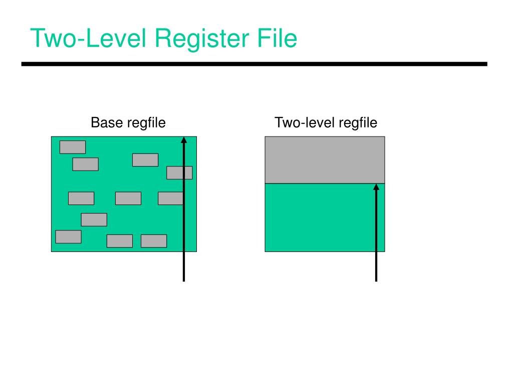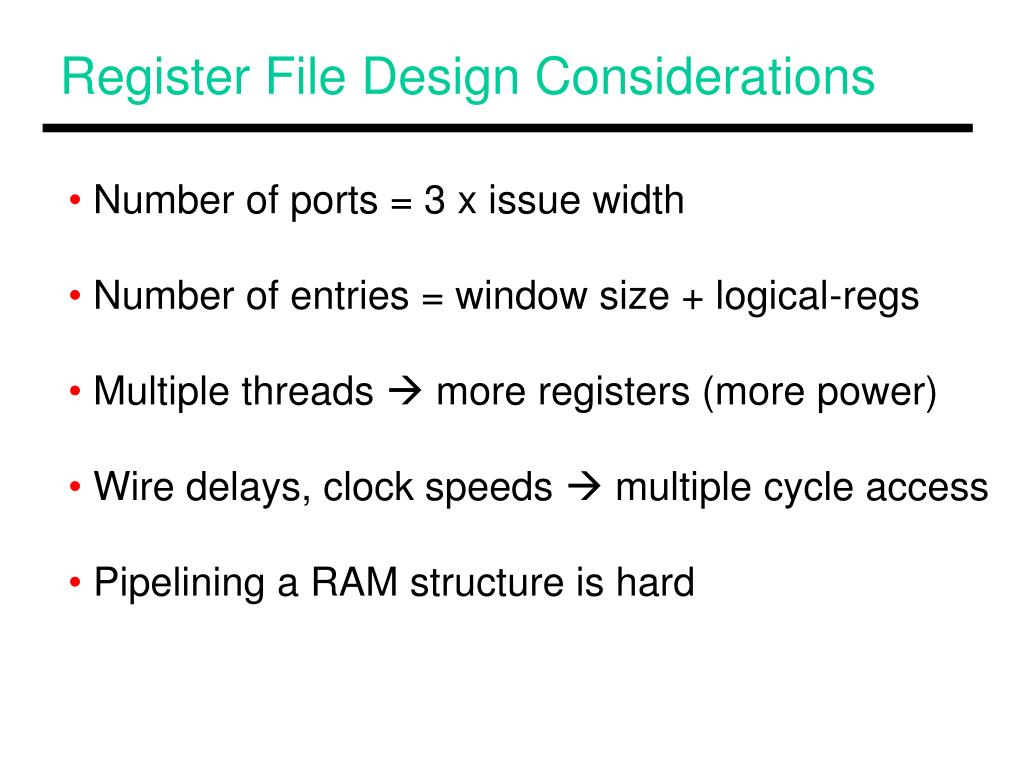 Register File Design Considerations • Number of ports = 3 x issue width • Number of entries = window size + logical-regs • Multiple threads more registers (more power) • Wire delays, clock speeds multiple cycle access • Pipelining a RAM structure is hard