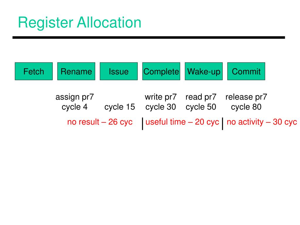 Register Allocation Fetch Rename Issue Complete Wake-up Commit assign pr7 cycle 4 cycle 15 write pr7 cycle 30 read pr7 cycle 50 release pr7 cycle 80 no result – 26 cyc useful time – 20 cyc no activity – 30 cyc