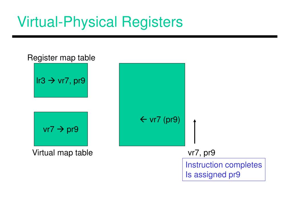 Virtual-Physical Registers Register map table lr3 vr7, pr9 vr7 (pr9) vr7 pr9 Virtual map table vr7, pr9 Instruction completes Is assigned pr9