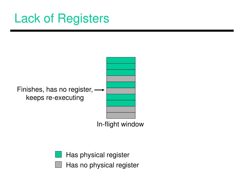 Lack of Registers Finishes, has no register, keeps re-executing In-flight window Has physical register Has no physical register