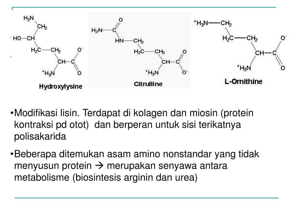 Modifikasi lisin. Terdapat di kolagen dan miosin (protein kontraksi pd otot) dan berperan untuk sisi terikatnya polisakarida • Beberapa ditemukan asam amino nonstandar yang tidak menyusun protein merupakan senyawa antara metabolisme (biosintesis arginin dan urea)