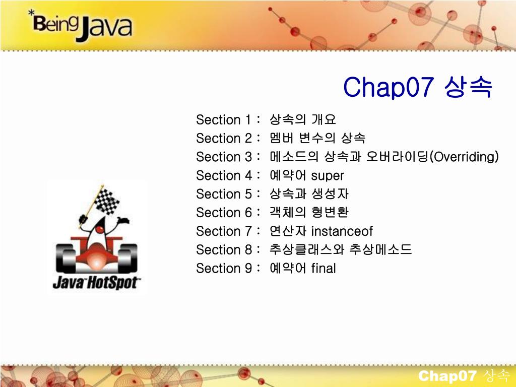 Chap07 상속 Section 1 : 상속의 개요 Section 2 : 멤버 변수의 상속 Section 3 : 메소드의 상속과 오버라이딩(Overriding) Section 4 : 예약어 super Section 5 : 상속과 생성자 Section 6 : 객체의 형변환 Section 7 : 연산자 instanceof Section 8 : 추상클래스와 추상메소드 Section 9 : 예약어 final