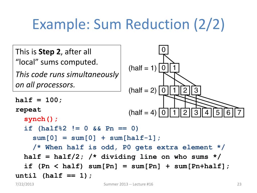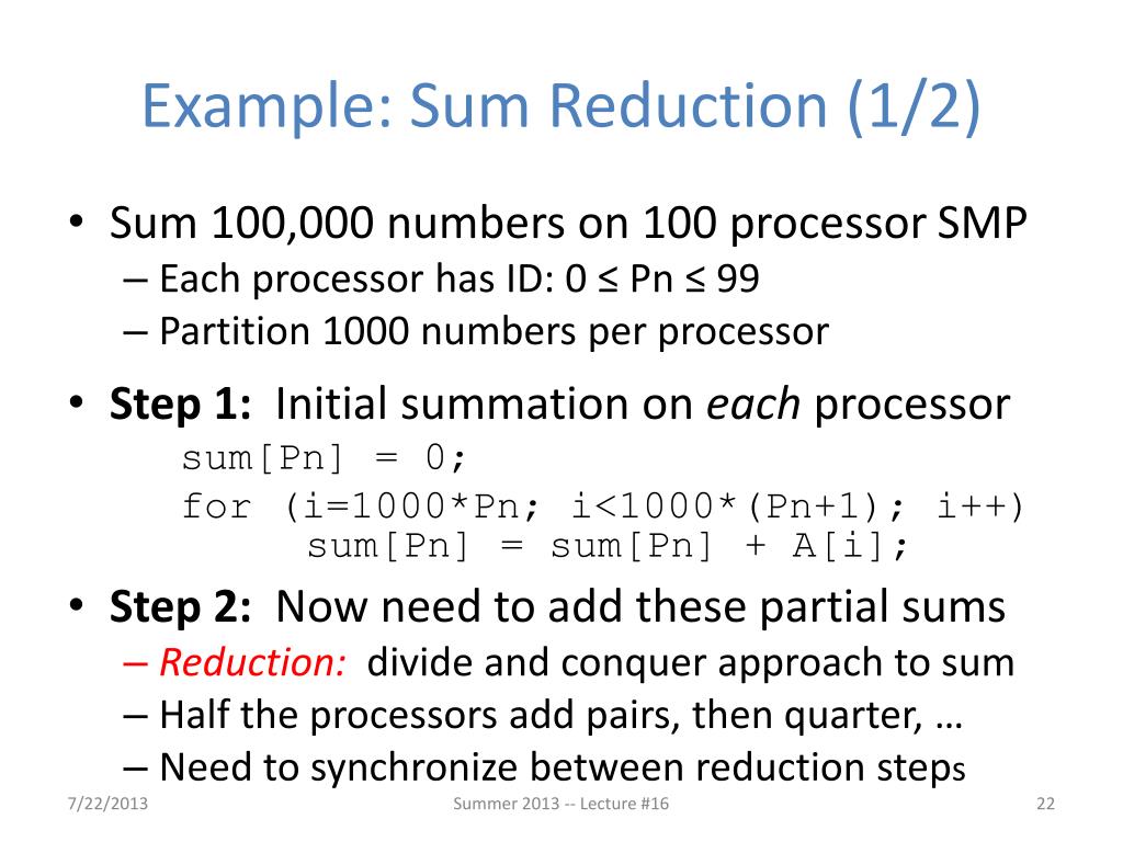 Example: Sum Reduction (1/2) • Sum 100,000 numbers on 100 processor SMP • Each processor has ID: 0 ≤ Pn ≤ 99 • Partition 1000 numbers per processor • Step 1: Initial summation on eachprocessor sum[Pn] = 0; for (i=1000*Pn; i<1000*(Pn+1); i++) sum[Pn] = sum[Pn] + A[i]; • Step 2: Now need to add these partial sums • Reduction:divide and conquer approach to sum • Half the processors add pairs, then quarter, … • Need to synchronize between reduction steps Summer 2013 -- Lecture #16