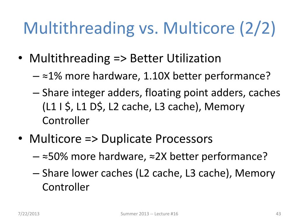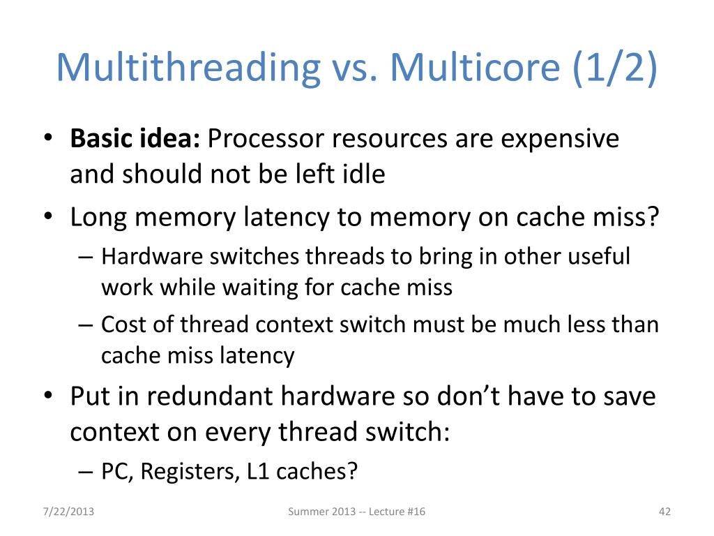 Multithreading vs. Multicore (1/2) • Basic idea: Processor resources are expensive and should not be left idle • Long memory latency to memory on cache miss? • Hardware switches threads to bring in other useful work while waiting for cache miss • Cost of thread context switch must be much less than cache miss latency • Put in redundant hardware so don’t have to save context on every thread switch: • PC, Registers, L1 caches? Summer 2013 -- Lecture #16