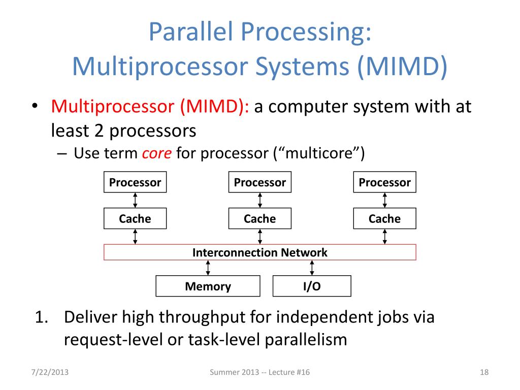 Parallel Processing:Multiprocessor Systems (MIMD) Processor Processor Processor • Multiprocessor (MIMD): a computer system with at least 2 processors • Use term core for processor (“multicore”) • Deliver high throughput for independent jobs via request-level or task-level parallelism Cache Cache Cache Interconnection Network Memory I/O Summer 2013 -- Lecture #16