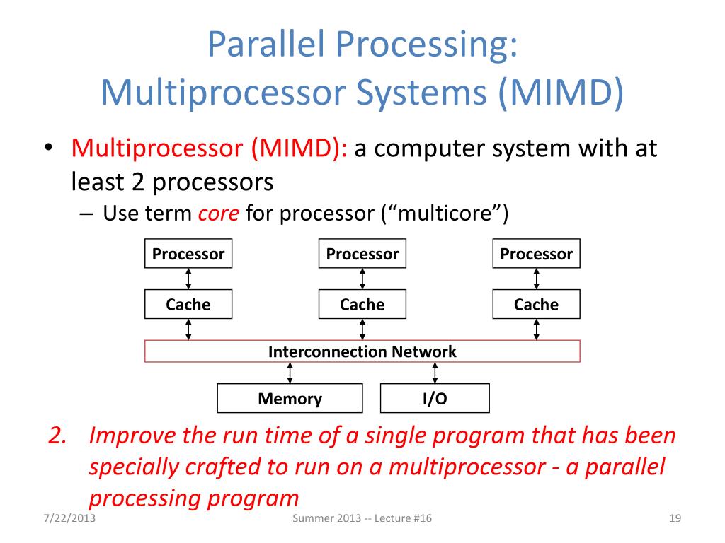 Parallel Processing:Multiprocessor Systems (MIMD) Processor Processor Processor • Multiprocessor (MIMD): a computer system with at least 2 processors • Use term core for processor (“multicore”) • Improve the run time of a single program that has been specially crafted to run on a multiprocessor - a parallel processing program Cache Cache Cache Interconnection Network Memory I/O Summer 2013 -- Lecture #16