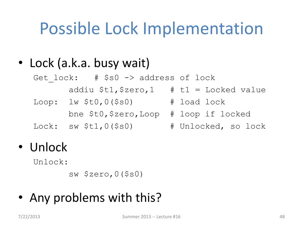 Possible Lock Implementation • Lock (a.k.a. busy wait) Get_lock: # $s0 -> address of lock addiu $t1,$zero,1 # t1 = Locked value Loop: lw $t0,0($s0) # load lock bne $t0,$zero,Loop # loop if locked Lock: sw $t1,0($s0) # Unlocked, so lock • Unlock Unlock: sw $zero,0($s0) • Any problems with this? Summer 2013 -- Lecture #16