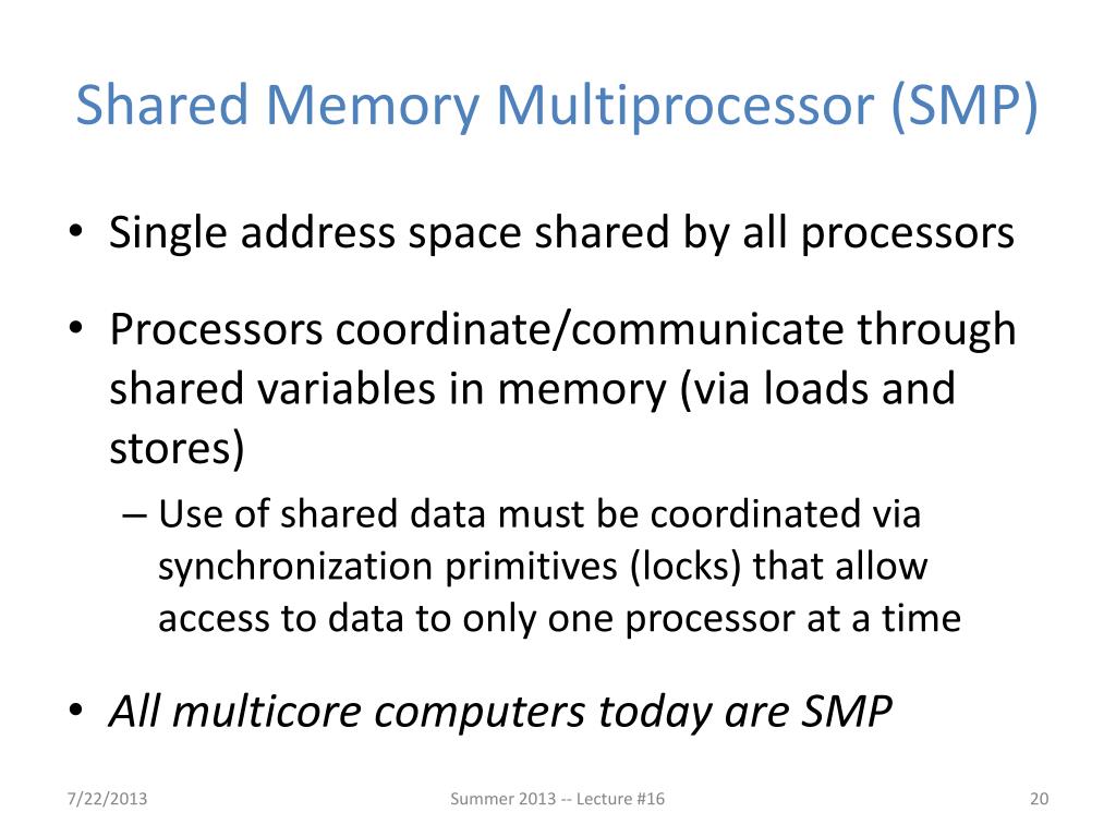 Shared Memory Multiprocessor (SMP) • Single address space shared by all processors • Processors coordinate/communicate through shared variables in memory (via loads and stores) • Use of shared data must be coordinated via synchronization primitives (locks) that allow access to data to only one processor at a time • All multicore computers today are SMP Summer 2013 -- Lecture #16