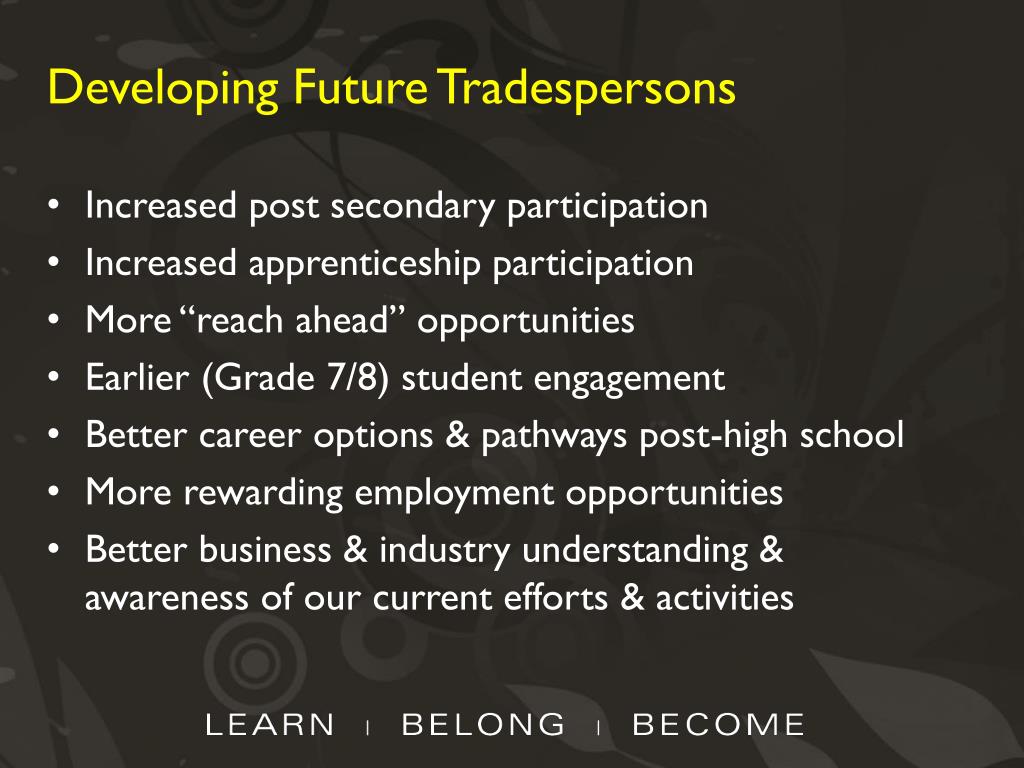 Developing Future Tradespersons • Increased post secondary participation • Increased apprenticeship participation • More “reach ahead” opportunities • Earlier (Grade 7/8) student engagement • Better career options & pathways post-high school • More rewarding employment opportunities • Better business & industry understanding & awareness of our current efforts & activities