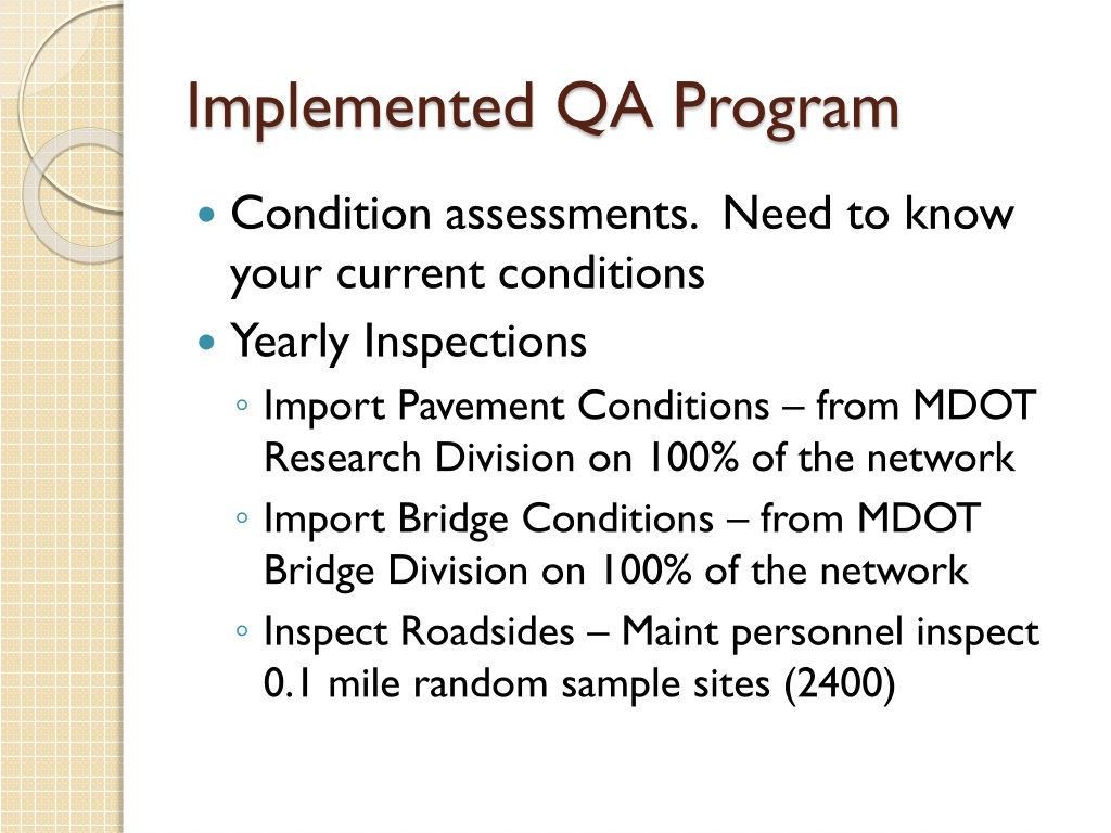 Implemented QA Program • Condition assessments. Need to know your current conditions • Yearly Inspections • Import Pavement Conditions – from MDOT Research Division on 100% of the network • Import Bridge Conditions – from MDOT Bridge Division on 100% of the network • Inspect Roadsides – Maint personnel inspect 0.1 mile random sample sites (2400)
