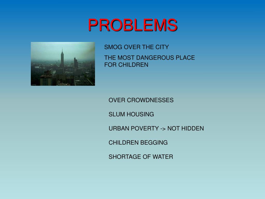 PROBLEMS SMOG OVER THE CITY THE MOST DANGEROUS PLACE FOR CHILDREN OVER CROWDNESSES SLUM HOUSING URBAN POVERTY -> NOT HIDDEN CHILDREN BEGGING SHORTAGE OF WATER