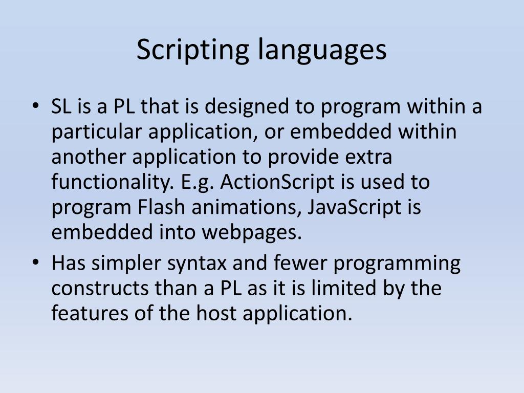 Scripting does not usually require complicated coding (usually no more than 5-10 lines because it only has one main function). • Can be to send a user to another screen depending on some condition, to perform a simple calculation, to validate some input, to change an attribute etc. • Script is often attached to an object already in the application, such as a button or object.This can often mean that all coding is not in the same location as it is with a PL; this can create problems keeping track of extensive amounts of scripting code. • Using a SL means that much of the user interface does not need to be built, saving time and effort.