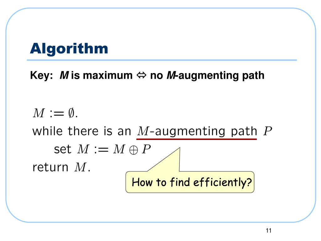 Algorithm Key: M is maximum no M-augmenting path How to find efficiently? How to find efficiently?
