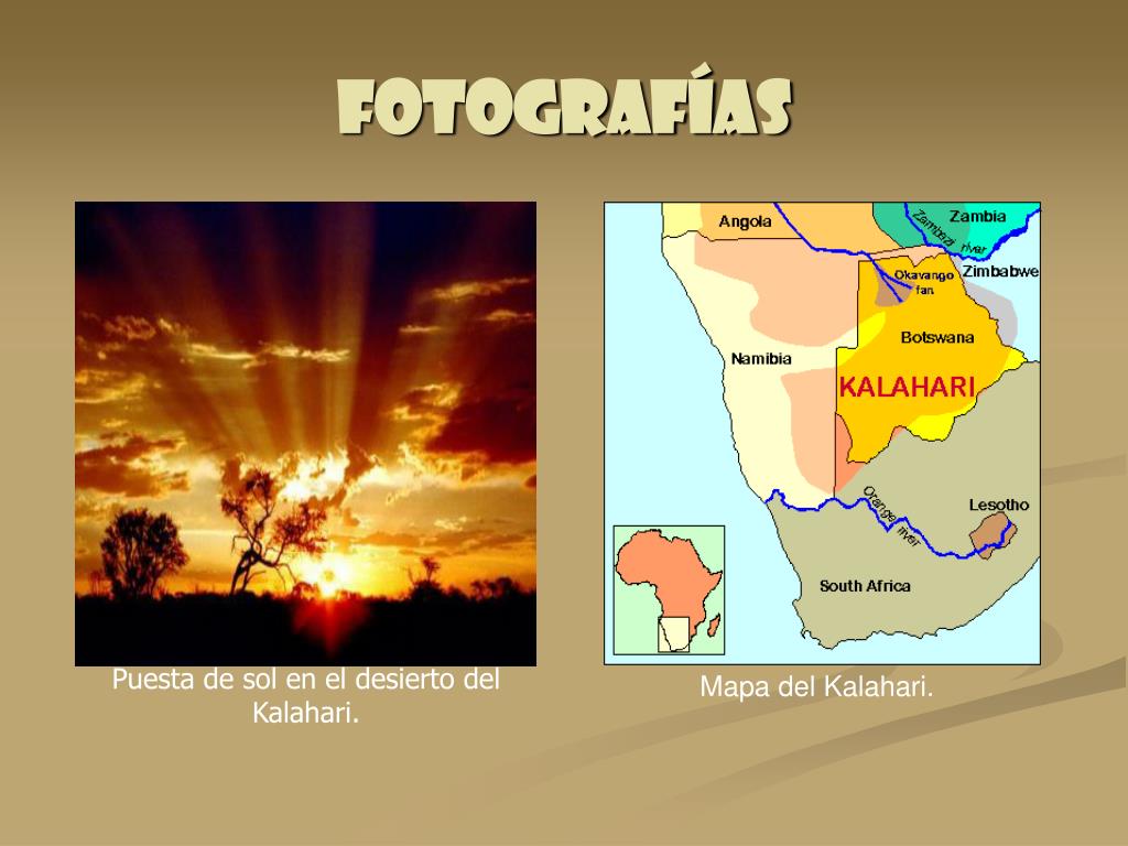Fotografías Puesta de sol en el desierto del Kalahari. Mapa del Kalahari.