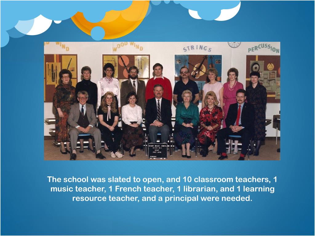 The school was slated to open, and 10 classroom teachers, 1 music teacher, 1 French teacher, 1 librarian, and 1 learning resource teacher, and a principal were needed.