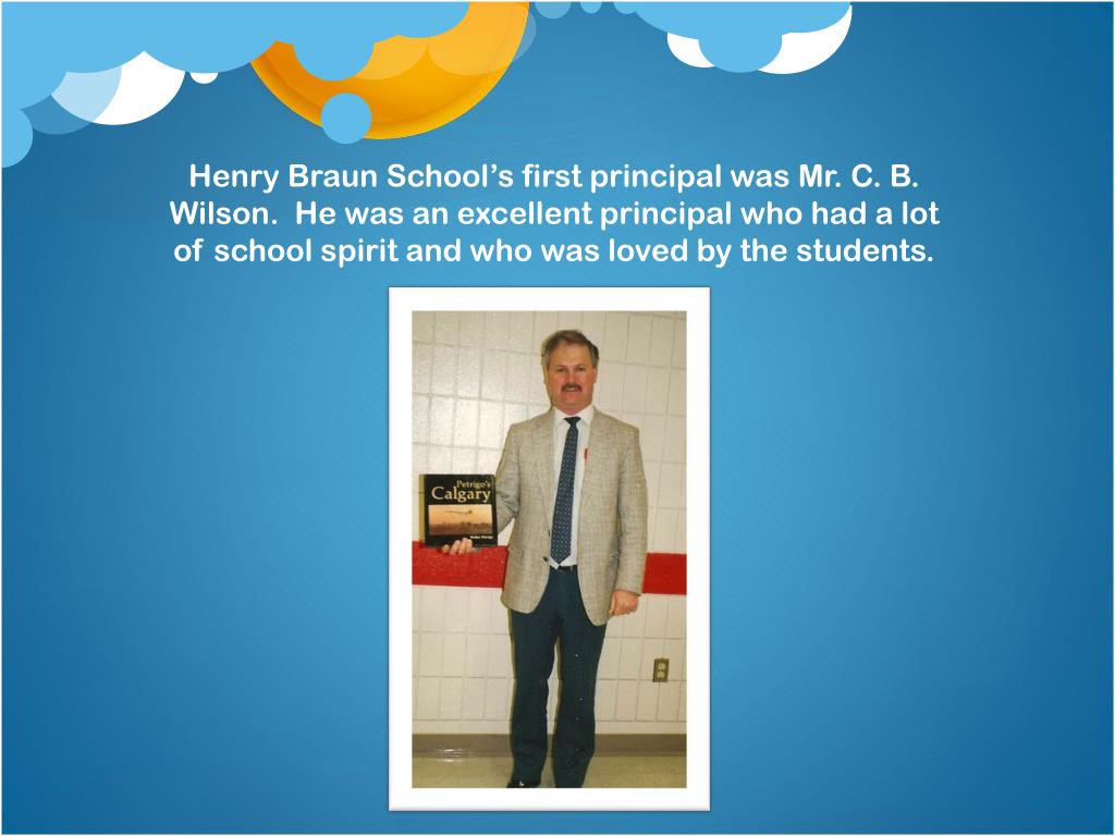 Henry Braun School’s first principal was Mr. C. B. Wilson. He was an excellent principal who had a lot of school spirit and who was loved by the students.
