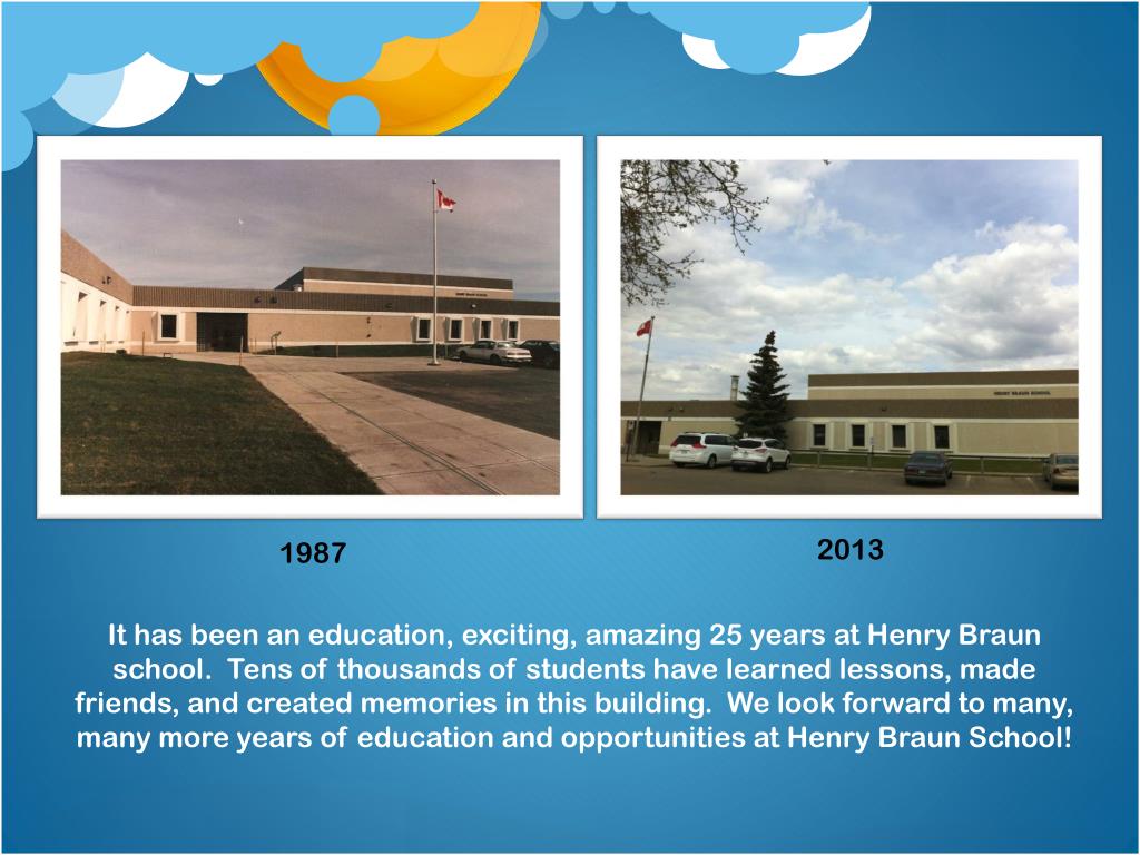 2013 1987 It has been an education, exciting, amazing 25 years at Henry Braun school. Tens of thousands of students have learned lessons, made friends, and created memories in this building. We look forward to many, many more years of education and opportunities at Henry Braun School!