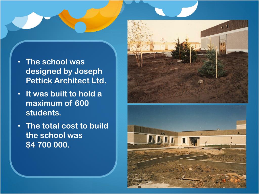 The school was designed by Joseph Pettick Architect Ltd. It was built to hold a maximum of 600 students. The total cost to build the school was $4 700 000.