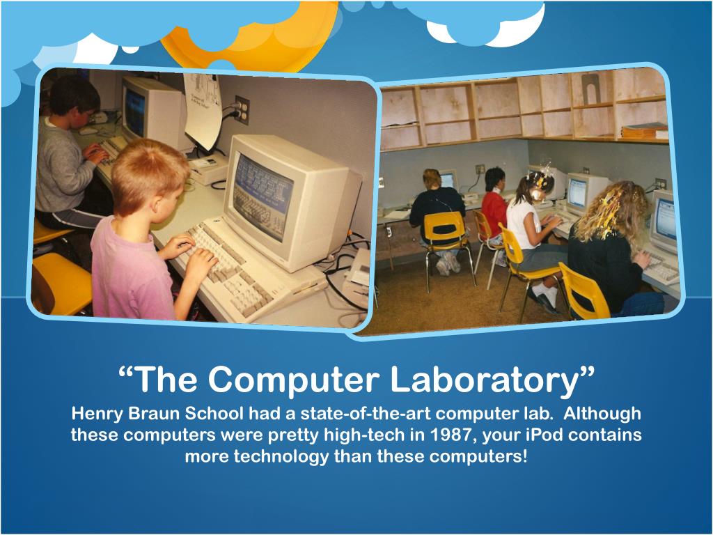 “The Computer Laboratory” Henry Braun School had a state-of-the-art computer lab. Although these computers were pretty high-tech in 1987, your iPod contains more technology than these computers!