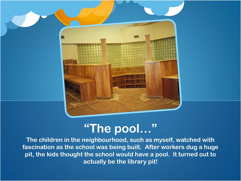 “The pool…” The children in the neighbourhood, such as myself, watched with fascination as the school was being built. After workers dug a huge pit, the kids thought the school would have a pool. It turned out to actually be the library pit!