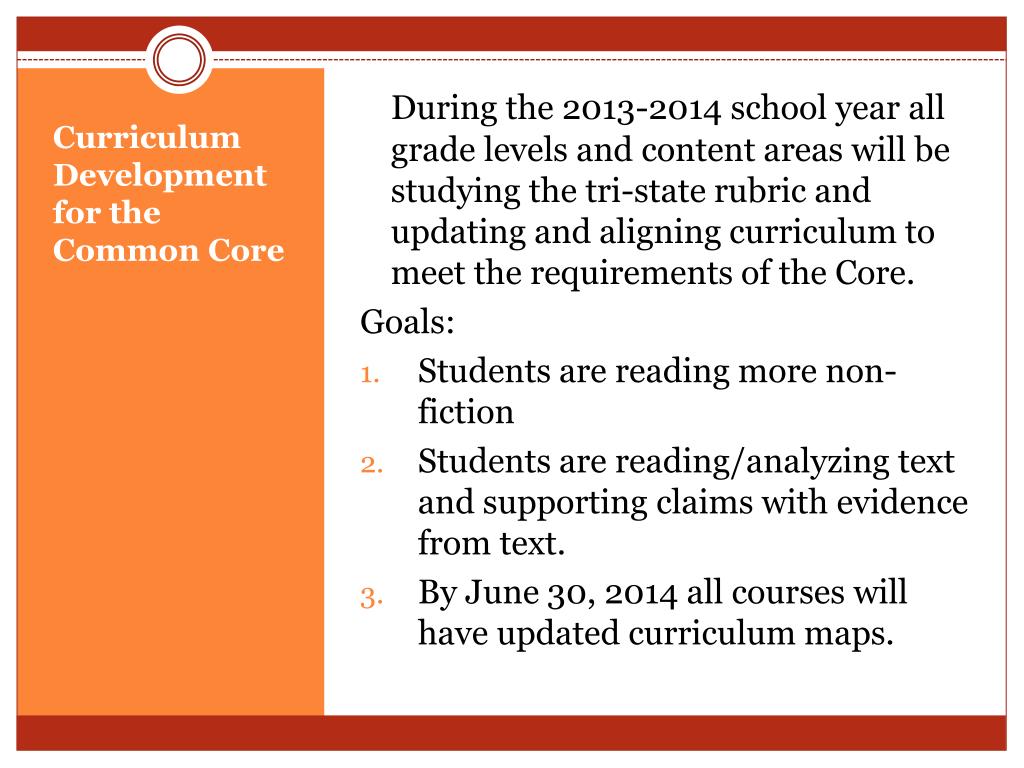 During the 2013-2014 school year all grade levels and content areas will be studying the tri-state rubric and updating and aligning curriculum to meet the requirements of the Core. Goals: • Students are reading more non-fiction • Students are reading/analyzing text and supporting claims with evidence from text. • By June 30, 2014 all courses will have updated curriculum maps. Curriculum Development for the Common Core