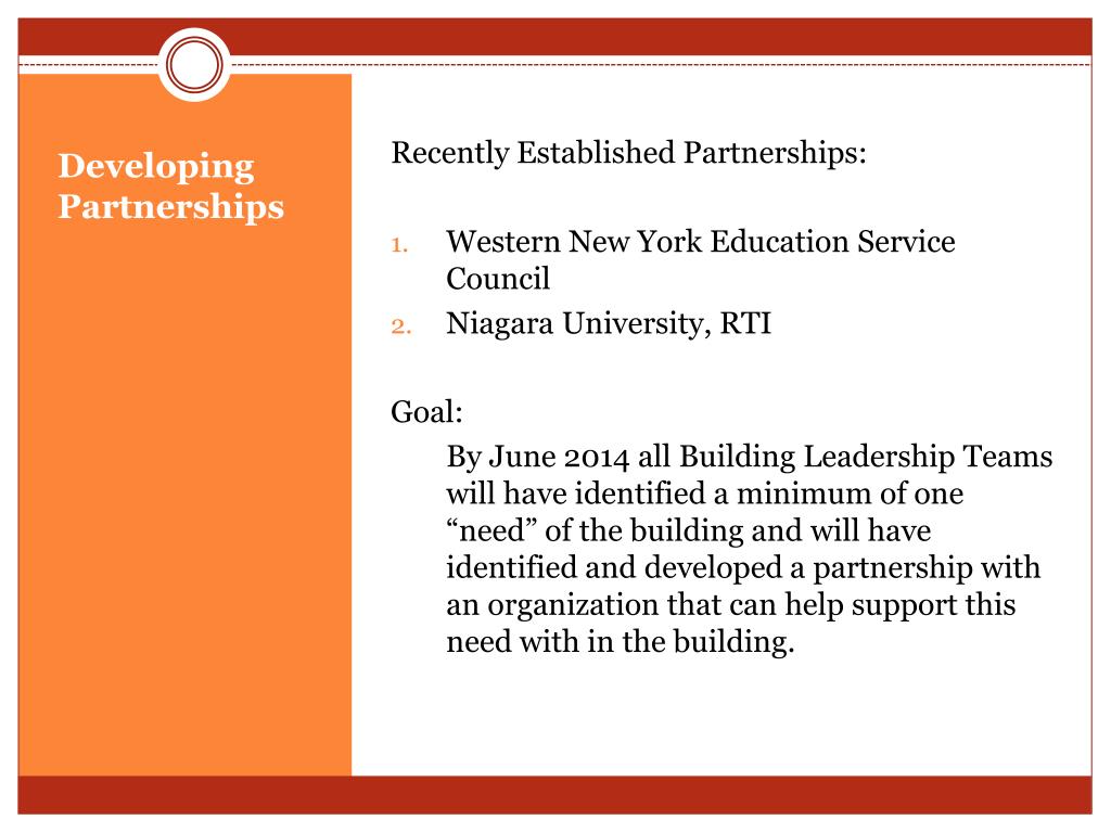 Recently Established Partnerships: • Western New York Education Service Council • Niagara University, RTI Goal: By June 2014 all Building Leadership Teams will have identified a minimum of one “need” of the building and will have identified and developed a partnership with an organization that can help support this need with in the building. Developing Partnerships