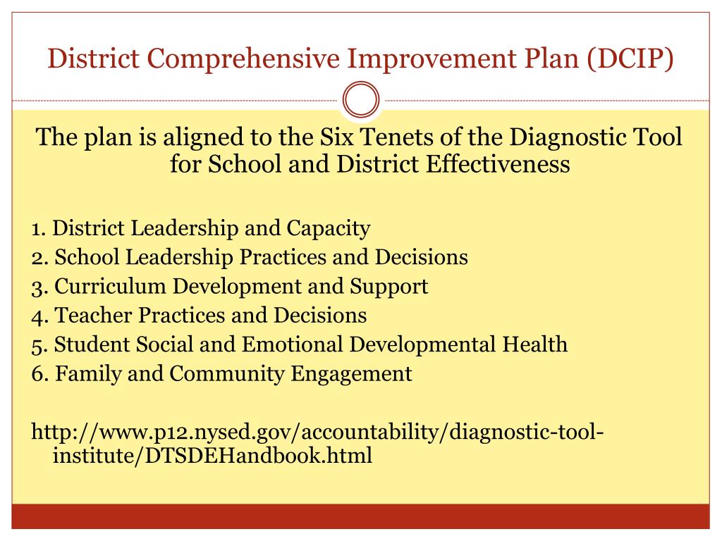 District Comprehensive Improvement Plan (DCIP) The plan is aligned to the Six Tenets of the Diagnostic Tool for School and District Effectiveness 1. District Leadership and Capacity 2. School Leadership Practices and Decisions 3. Curriculum Development and Support 4. Teacher Practices and Decisions 5. Student Social and Emotional Developmental Health 6. Family and Community Engagement http://www.p12.nysed.gov/accountability/diagnostic-tool-institute/DTSDEHandbook.html