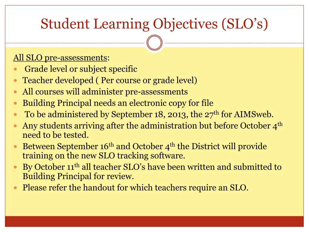 Student Learning Objectives (SLO’s) All SLO pre-assessments: Grade level or subject specific Teacher developed ( Per course or grade level) All courses will administer pre-assessments Building Principal needs an electronic copy for file To be administered by September 18, 2013, the 27th for AIMSweb. Any students arriving after the administration but before October 4th need to be tested. Between September 16th and October 4th the District will provide training on the new SLO tracking software. By October 11th all teacher SLO’s have been written and submitted to Building Principal for review. Please refer the handout for which teachers require an SLO.