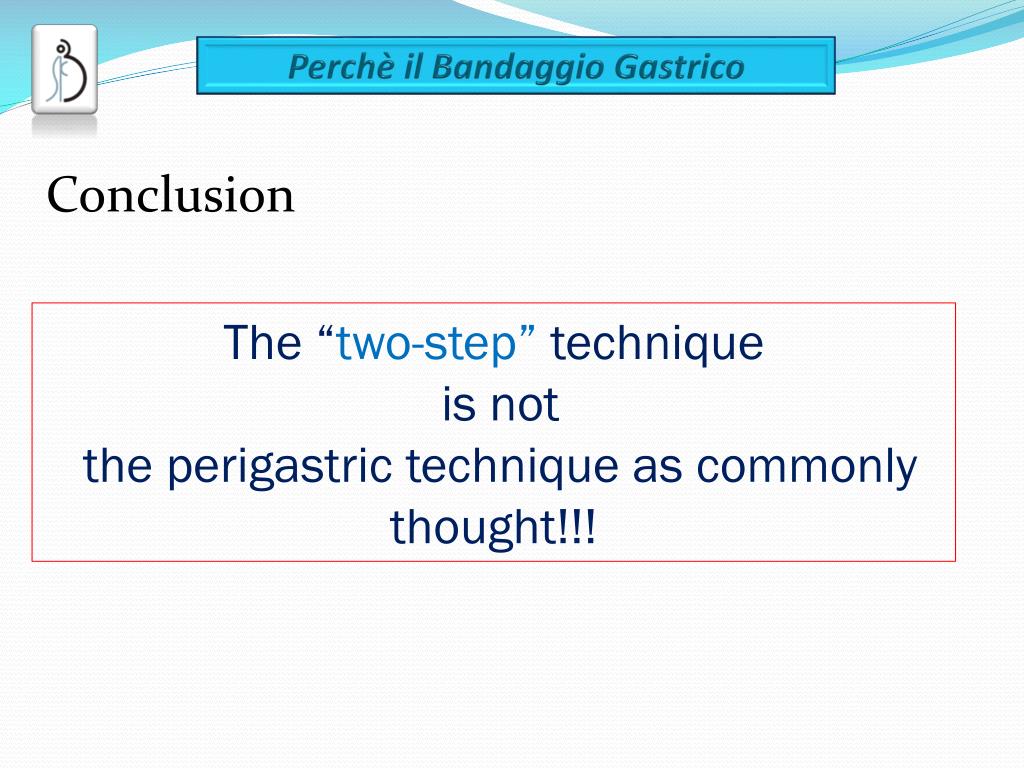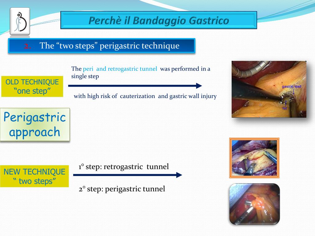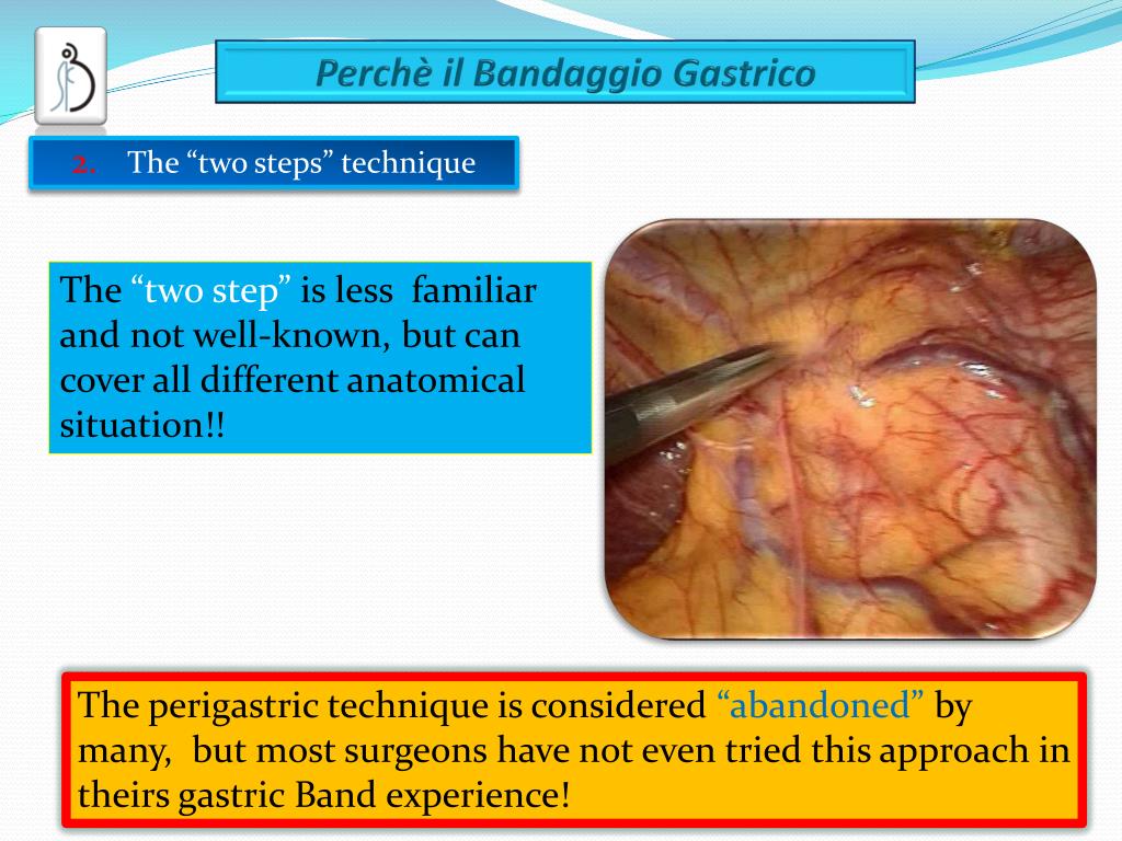 The “two steps” technique The “two step” is less familiar and not well-known, but can cover all different anatomical situation!! The perigastric technique is considered “abandoned” by many, but most surgeons have not even tried this approach in theirs gastric Band experience!
