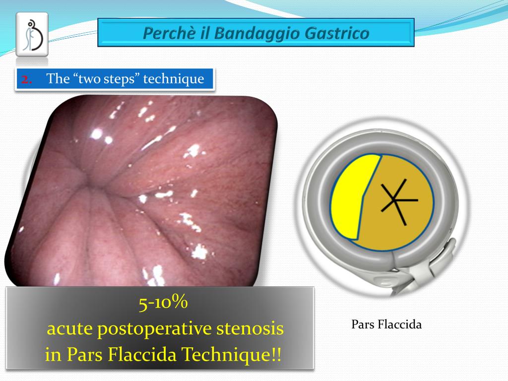 The “two steps” technique Perigastric • 5-10% • acute postoperative stenosis • in Pars Flaccida Technique!! Pars Flaccida