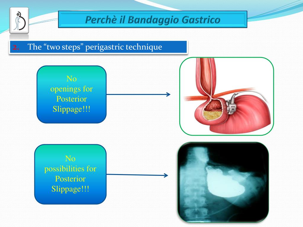 The “two steps” technique Perigastric Pars Flaccida • Correct band use • Homogeneous calibration • NO homogeneous calibration • Early risk of acute obstruction