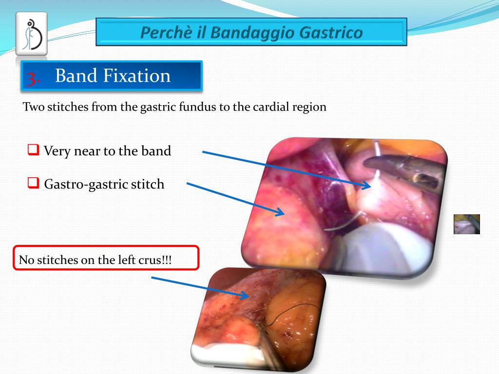 Band Fixation Two stitches from the gastric fundus to the cardial region • Very near to the band • Gastro-gastric stitch No stitches on the left crus!!!