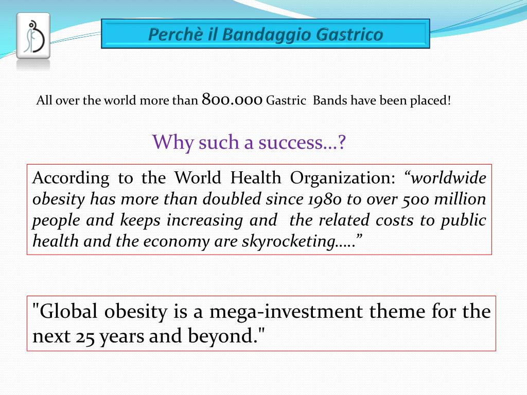 All over the world more than 800.000 Gastric Bands have been placed! Why such a success…? According to the World Health Organization: “worldwide obesity has more than doubled since 1980 to over 500 million people and keeps increasing and the related costs to public health and the economy are skyrocketing…..” "Global obesity is a mega-investment theme for the next 25 years and beyond."
