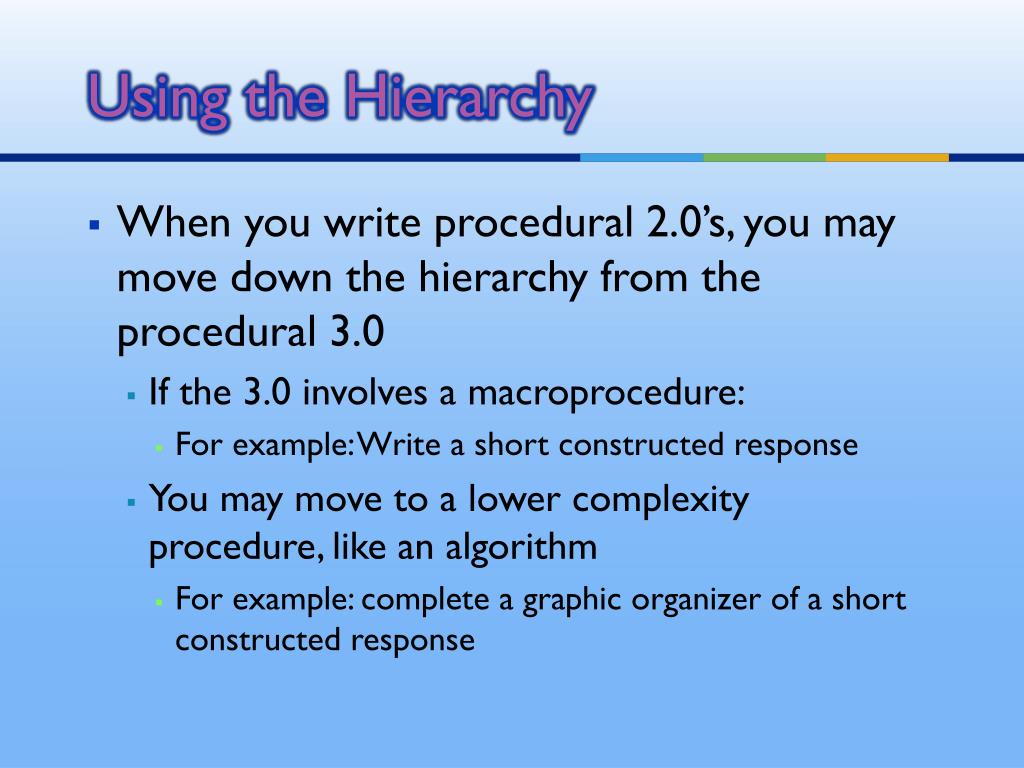 Using the Hierarchy • When you write procedural 2.0’s, you may move down the hierarchy from the procedural 3.0 • If the 3.0 involves a macroprocedure: • For example: Write a short constructed response • You may move to a lower complexity procedure, like an algorithm • For example: complete a graphic organizer of a short constructed response
