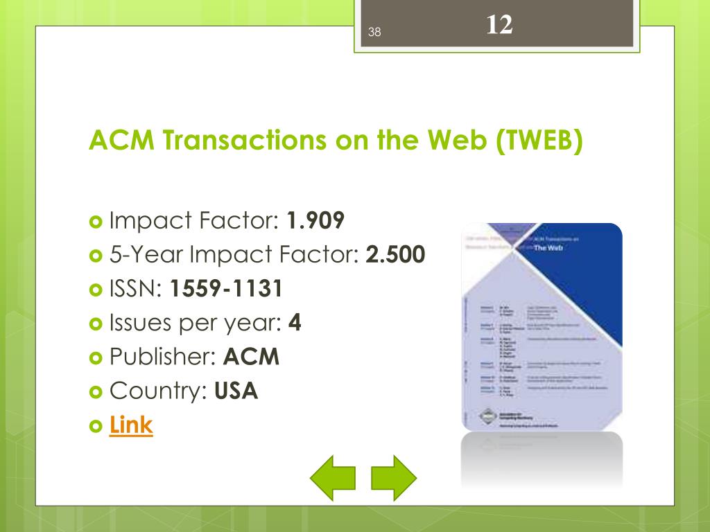 12 ACM Transactions on the Web (TWEB) • Impact Factor: 1.909 • 5-Year Impact Factor: 2.500 • ISSN: 1559-1131 • Issues per year: 4 • Publisher: ACM • Country: USA • Link