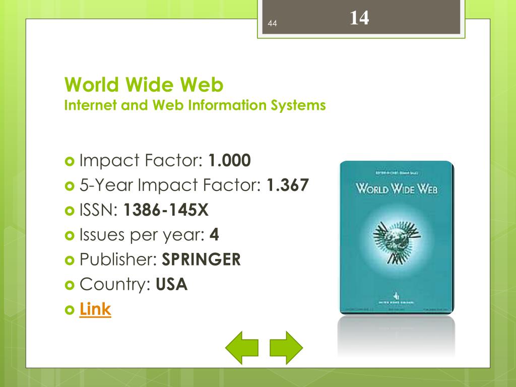 14 World Wide WebInternet and Web Information Systems • Impact Factor: 1.000 • 5-Year Impact Factor: 1.367 • ISSN: 1386-145X • Issues per year: 4 • Publisher: SPRINGER • Country: USA • Link