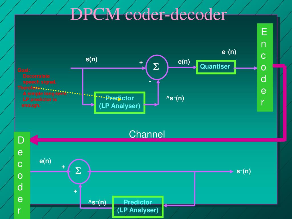 DPCM coder-decoder(improved version) E n c o d e r s(n) e~(n) + e(n) S Quantiser - ^s~(n) ^s~(n) All-zero Linear Filter + + s~(n) S Predictor (LP Analyser) S + + Channel D e c o d e r e(n) + S s~(n) ^s~(n) + s~(n) Predictor (LP Analyser) Predictor (LP Analyser) S + +