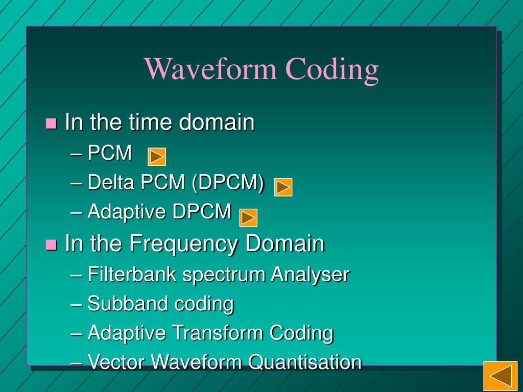 Speech Coding. Waveform Coding Vocoders Middle Term Evaluation. Waveform Coding. In the time domain PCM Delta PCM (DPCM) Adaptive DPCM In the Frequency Domain Filterbank spectrum Analyser Subband coding Adaptive Transform Coding Vector Waveform Quantisation. Pulse Code Modulation.