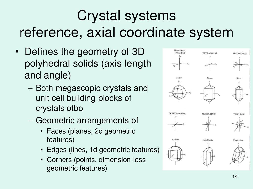 Crystal systems reference, axial coordinate system • Defines the geometry of 3D polyhedral solids (axis length and angle) • Both megascopic crystals and unit cell building blocks of crystals otbo • Geometric arrangements of • Faces (planes, 2d geometric features) • Edges (lines, 1d geometric features) • Corners (points, dimension-less geometric features)