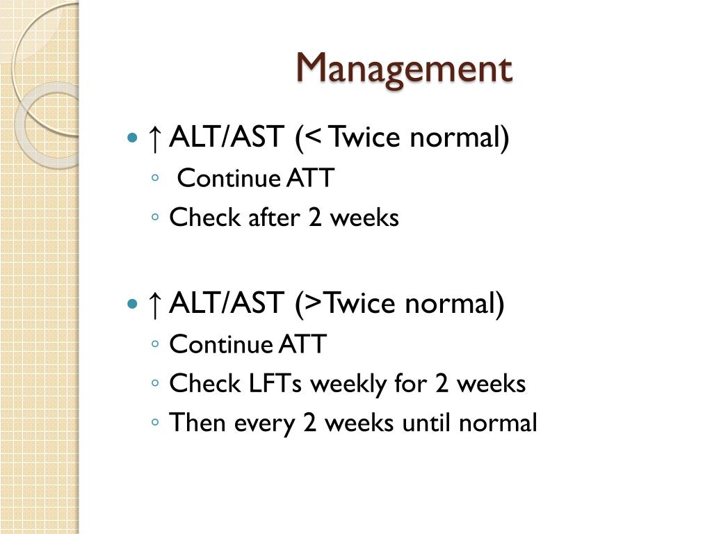 Management • ↑ ALT/AST (< Twice normal) • Continue ATT • Check after 2 weeks • ↑ ALT/AST (>Twice normal) • Continue ATT • Check LFTs weekly for 2 weeks • Then every 2 weeks until normal
