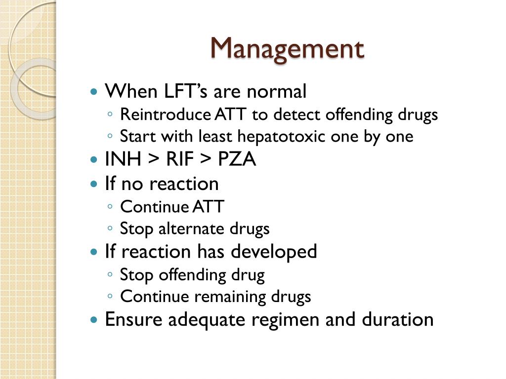 Management • When LFT’s are normal • Reintroduce ATT to detect offending drugs • Start with least hepatotoxic one by one • INH > RIF > PZA • If no reaction • Continue ATT • Stop alternate drugs • If reaction has developed • Stop offending drug • Continue remaining drugs • Ensure adequate regimen and duration