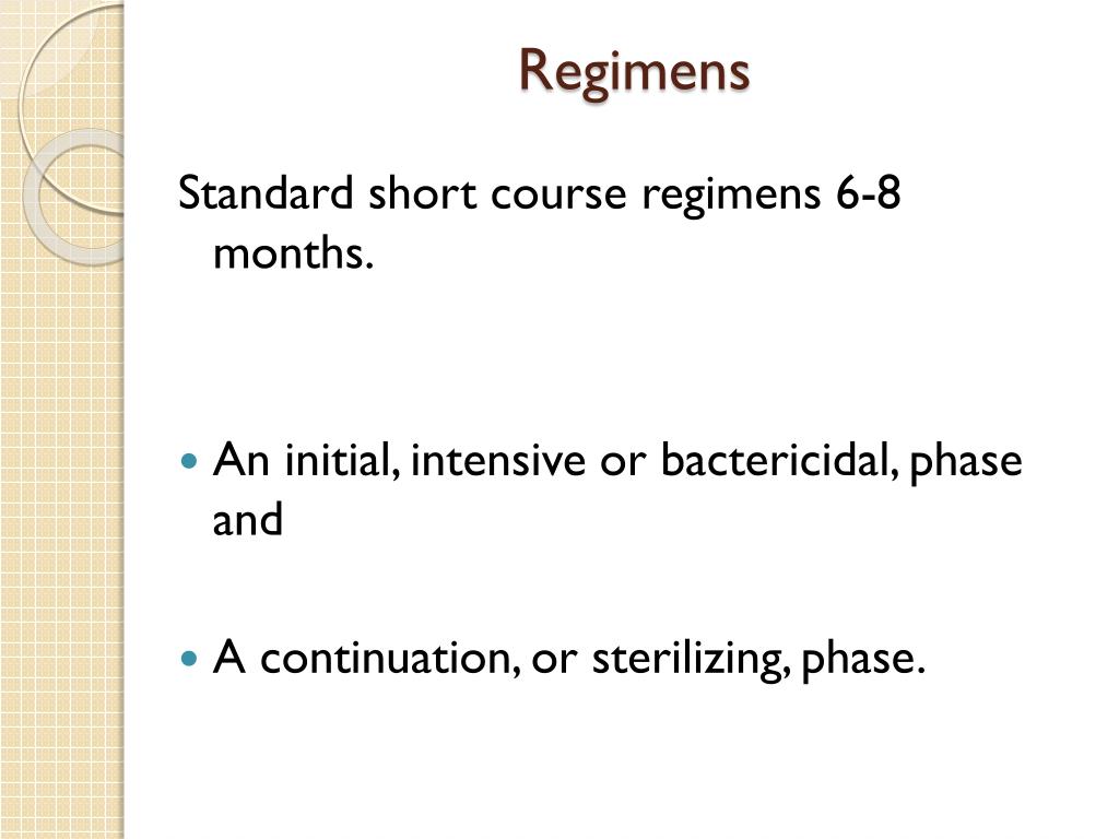 Regimens Standard short course regimens 6-8 months. An initial, intensive or bactericidal, phase and A continuation, or sterilizing, phase.