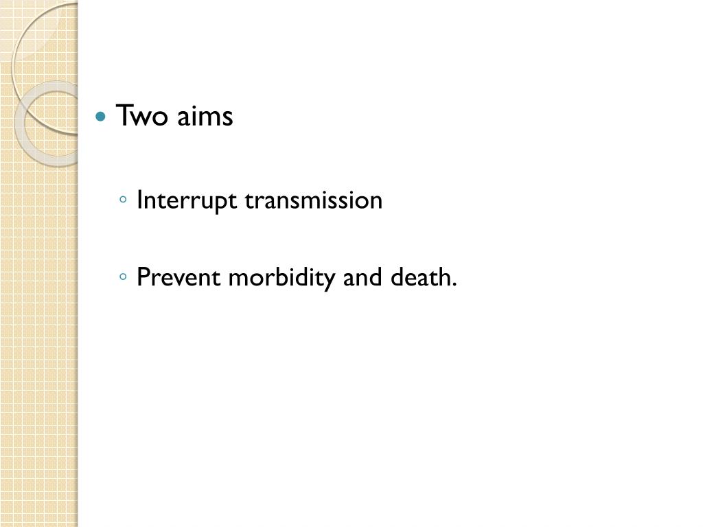 Two aims • Interrupt transmission • Prevent morbidity and death.