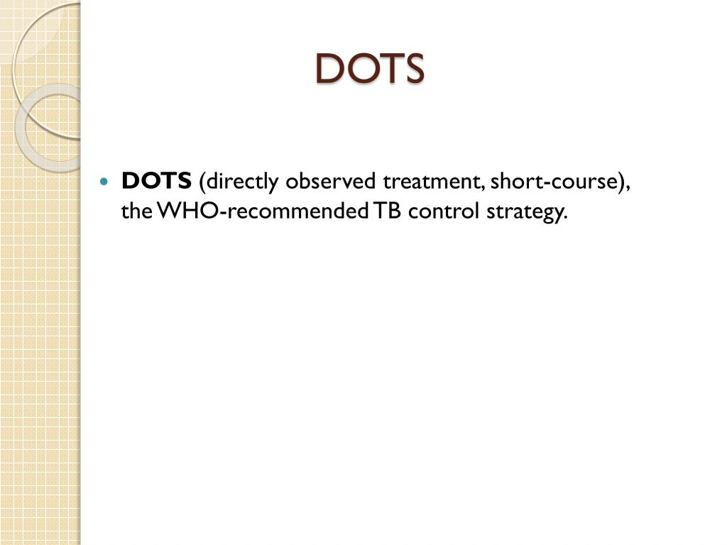 DOTS DOTS(directly observed treatment, short-course), the WHO-recommended TB control strategy.