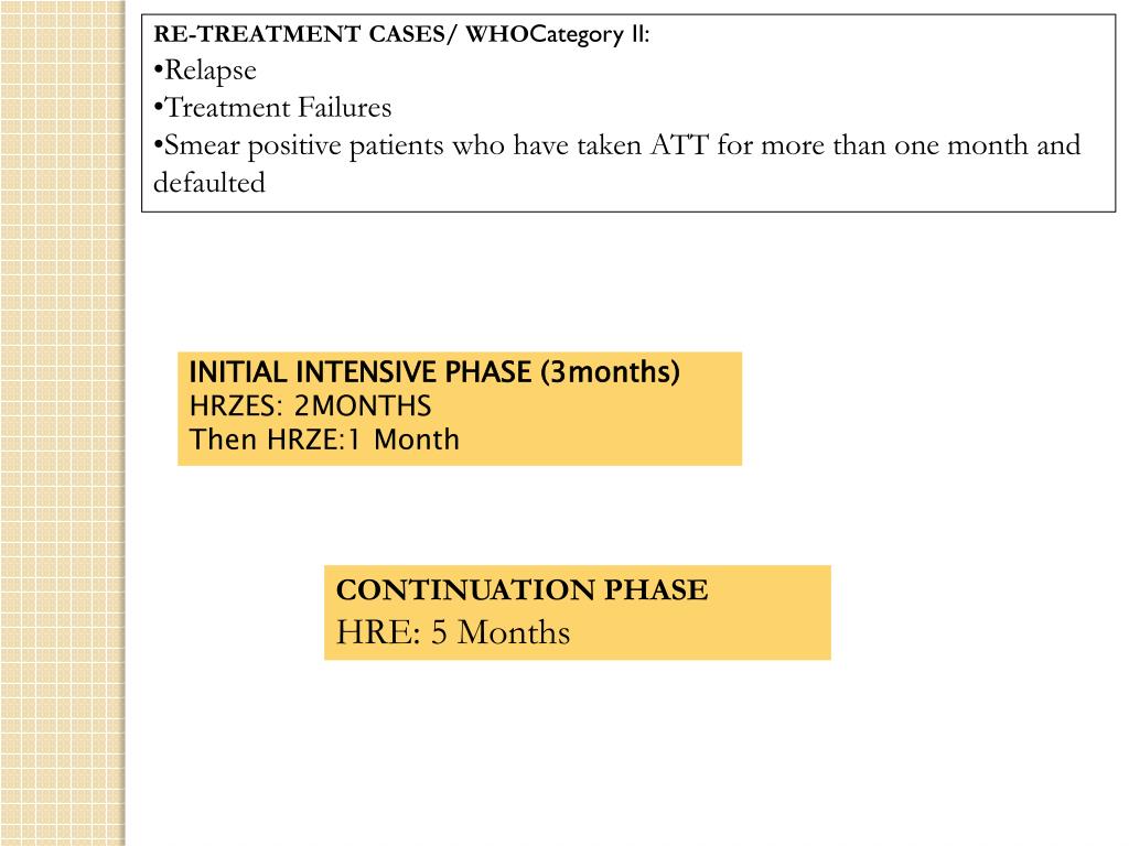 RE-TREATMENT CASES/ WHOCategory II: • Relapse • Treatment Failures • Smear positive patients who have taken ATT for more than one month and defaulted INITIAL INTENSIVE PHASE (3months)HRZES: 2MONTHS Then HRZE:1 Month CONTINUATION PHASE HRE: 5 Months