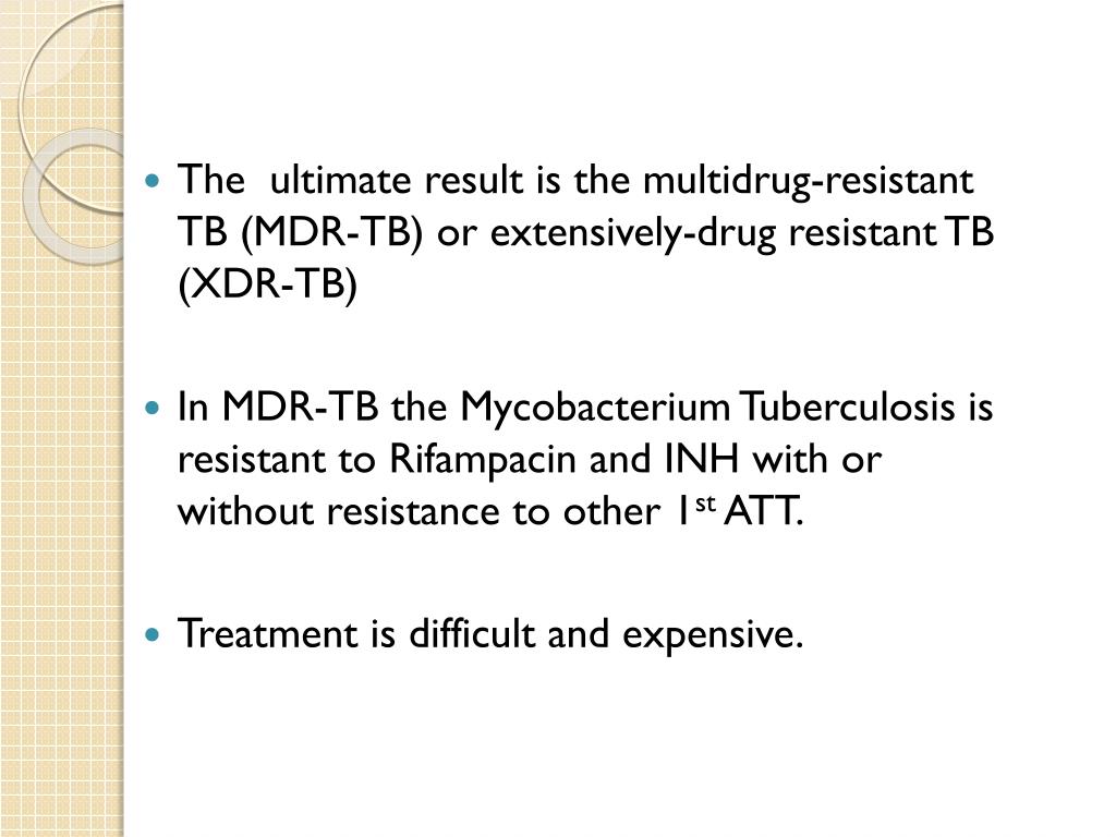 The ultimate result is the multidrug-resistant TB (MDR-TB) or extensively-drug resistant TB (XDR-TB) In MDR-TB the Mycobacterium Tuberculosis is resistant to Rifampacin and INH with or without resistance to other 1st ATT. Treatment is difficult and expensive.