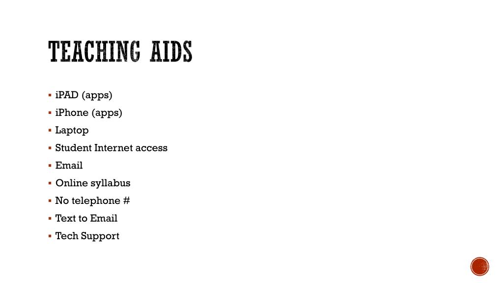 Teaching Aids • iPAD (apps) • iPhone (apps) • Laptop • Student Internet access • Email • Online syllabus • No telephone # • Text to Email • Tech Support